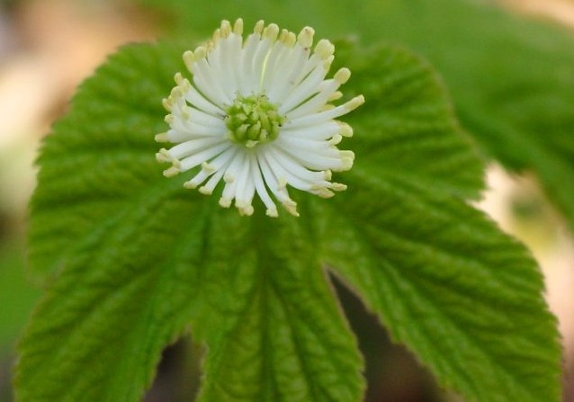 It is a small perennial herb, with a horizontal, irregularly knotted, bright yellow root-stock, from 1/4 inch to 3/4 inch thick, giving off slender roots below and marked with scars of the flower-stems of previous years. The flowering stem, which is pushed up early in the spring, is from 6 to 12 inches high, erect, cylindrical, hairy, with downward-pointing hairs, surrounded at the base with a few short, brown scales. It has two veined and wrinkled dark green, hairy leaves, placed high up, the lower one stalked, the upper stalkless, roundish in outline, but palmately cut into 5 to 7 lobes, the margins irregularly and finely toothed. The flower, which is produced in April, is solitary, terminal, erect and small, with three small greenish-white sepals, falling away immediately after expansion, no petals and numerous stamens. The fruit ripens in July and is a small, fleshy, oblong, crimson berry, much like a Raspberry in appearance, but is not edible.